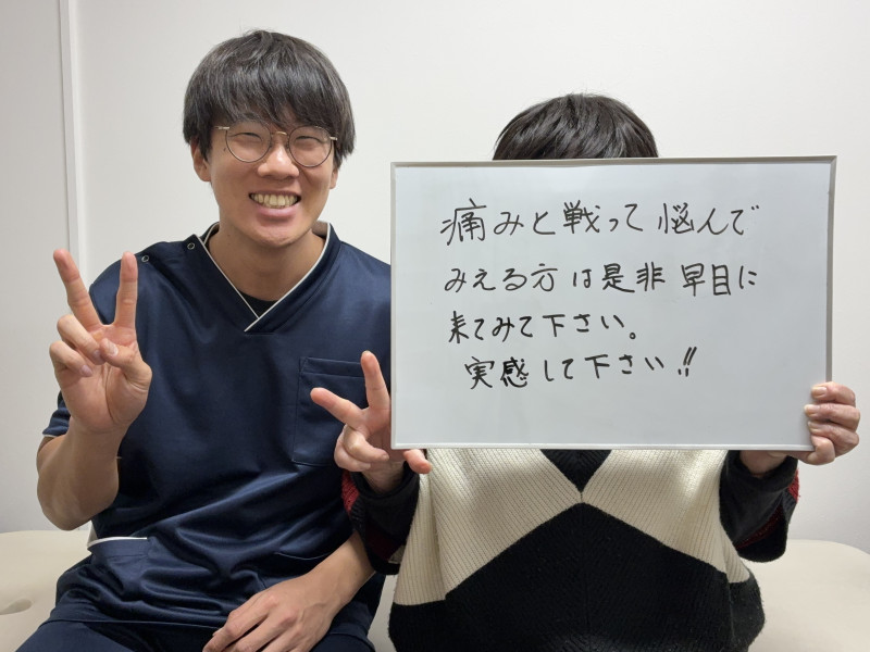 Q:整体院飛翔に来られる前はどんなお悩みがありましたか? A:股関節の痛みで仕事上体を使うことが多いので思うように動けなくて悩んでいました。 Q:そのお悩みを解決するために何をしていましたか? A:youtubeでストレッチ方法を調べてやったりしましたが治らなかったです。 Q:整体院飛翔のカウンセリング・施術はいかがでしたか? A:自分の股関節の痛みがお腹の筋肉の影響で出ていると教えてもらいました。施術後仕事をしていても痛みがなく驚いたことを覚えています。 Q:病院や他の施術院と比べて違う所はありましたか? A:自分で解決しようとしていましたが、プロに任せたほうが早く解決できると思いました。 Q:同じような症状をお持ちの方にメッセージをお願いします。 A:痛みで悩まれているなら早めに相談してみてください。先生なら早く改善できると思いますよ! (K.S様 20代 男性) ※効果には個人差があります |